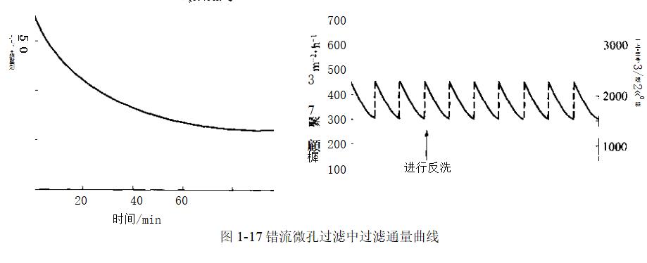 采用定期原位反沖洗對(duì)膜的清洗是有效果的.這種沖洗方式可以產(chǎn)生“鋸齒”形通量變化曲線(圖1-17),最終也會(huì)逐漸衰減為低通量