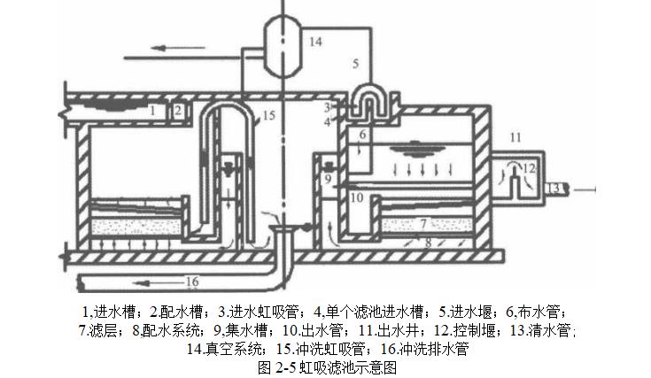 虹吸濾池的濾料組成和濾速選定與普通快濾池相同,采用小阻力配水系統(tǒng).所不同的是利用虹吸原理進(jìn)水和排走反洗水.