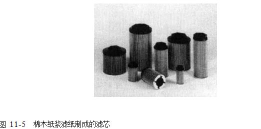 棉木紙漿濾紙纖維結(jié)構(gòu)與今天的化纖、玻纖及金屬纖維比較,它的纖維粗,不均且呈扁狀。其外表的粗糙不規(guī)則成為它吸附顆粒的優(yōu)勢,但纖維不細卻降低了它的吸附能力。因為纖維粗細才是過濾效果的關(guān)鍵。從植物纖維濾紙的顯微圖片(圖11-4)可見到其縱斷面纖維排列屬于由疏到密搭配,以達到迎油面纖維間隙大,更能儲灰的目的。棉木漿濾紙制成的濾芯見圖11-5。